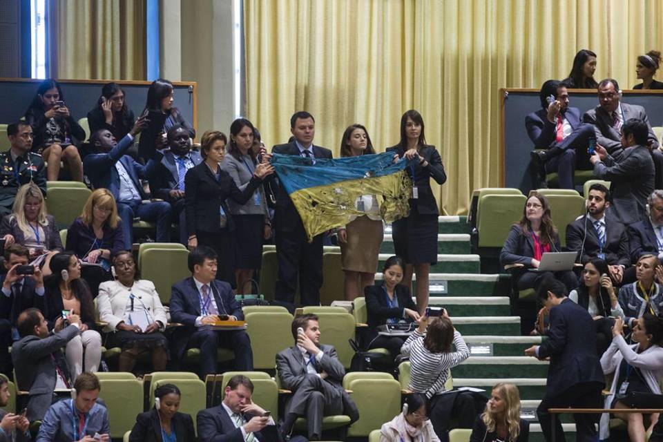 A delegação ucraniana abandonou o plenário da Assembleia-geral da ONU, em protesto contra o discurso do presidente russo. Os ucranianos também mostraram publicamente a bandeira da Ucrânia retirada do cerco de Ilovaysk, onde em resultado da agressão direta do exército russo morreram várias centenas dos militares ucranianos das FAU e das unidades voluntárias.