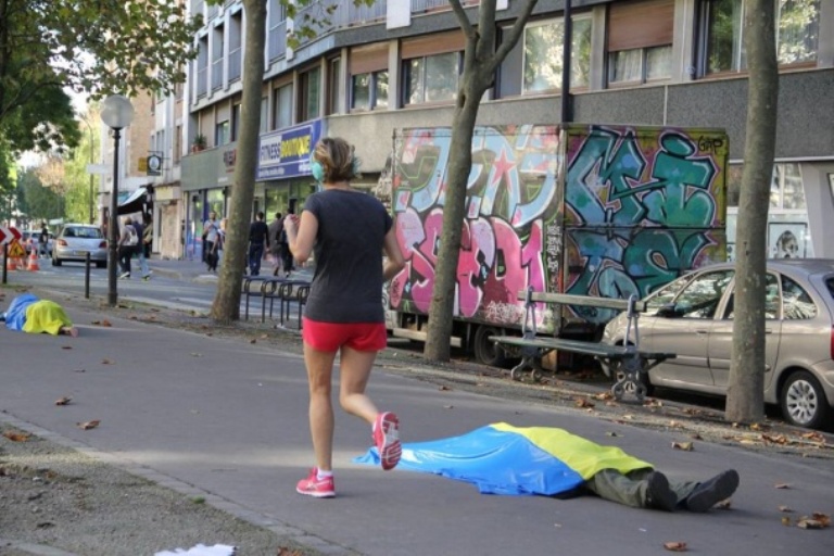 altura, os artistas se deitaram no asfalto se cobrindo com as bandeiras da Ucrânia. Na altura, muitos franceses passavam indiferentemente,