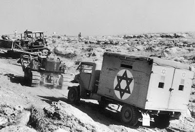 | Retroescavadora reboca o camião com militares israelitas feridos na guerra de 1948 foto @Keystone Features / Hulton Archive / Getty Images |