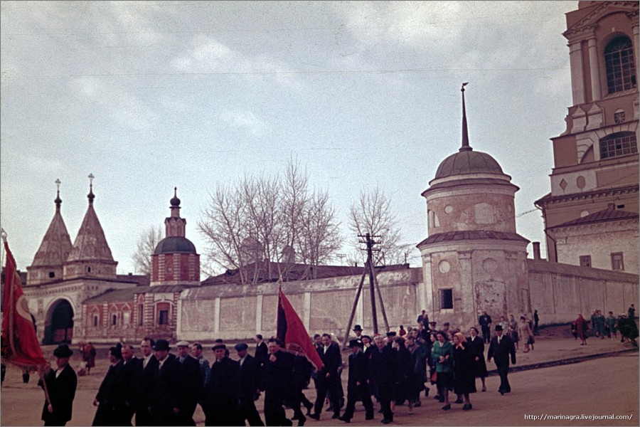 | Suzdal, rua Lenine. Manif com o fundo da Igreja Lazarevskaya, 1964. |