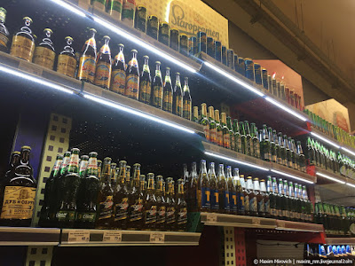 As montras de álcool são as mais bonitas [no primeiro plano a cerveja ucraniana “Obolon clara”, ao preço de 45 rublos]: