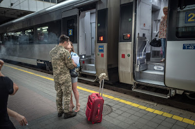 | Um casal se despede na plataforma de comboio/trem em Kyiv, quando o militar parte ao leste da Ucrânia © Charlie Bibby / FT |