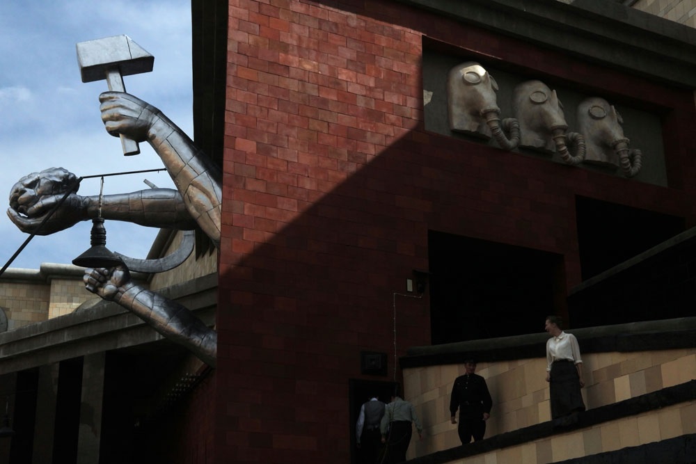 principal do pátio era uma composição de enormes mãos de metal segurando uma foice,